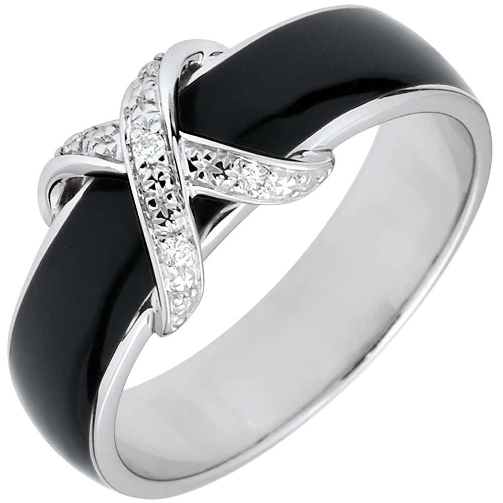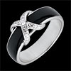 Pasek z białego złota wypełniony czarną laką otoczony na krzyż paskiem z białego złota wysadzanego diamentami.