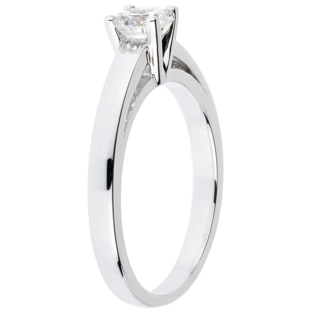 Surowa i elegancka oprawa w czterech krapach z białego złota podkreślająca urodę diamentu.