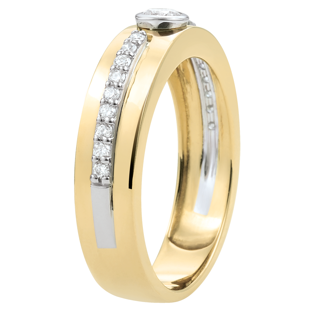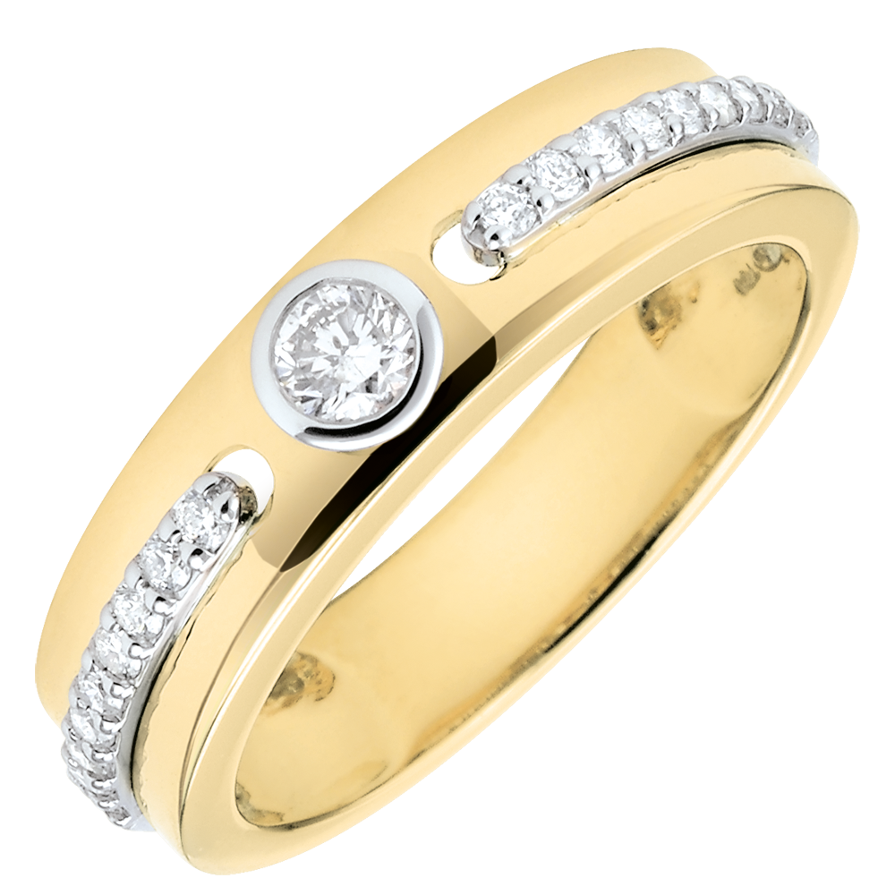 Dwie linie diamentów na obrączce z żółtego złota połączone wokół diamentu środkowego jako wyraz obietnicy wieczności.