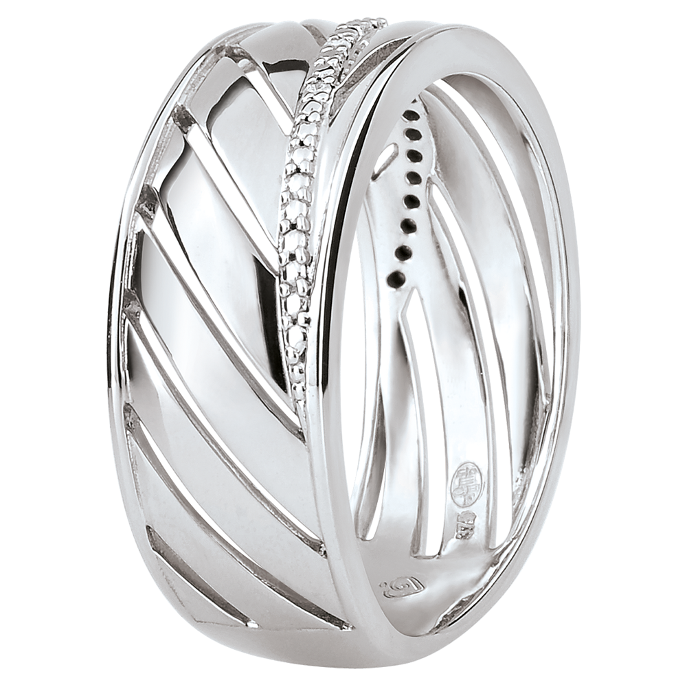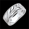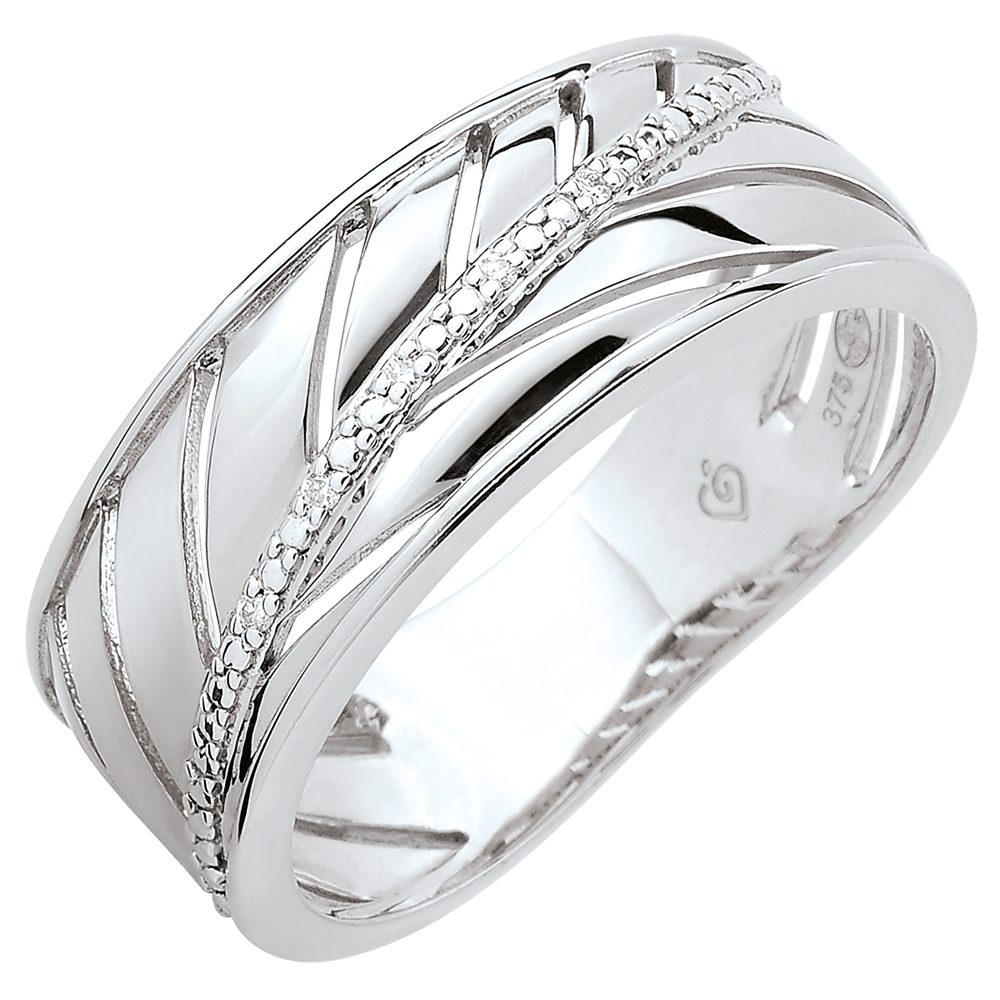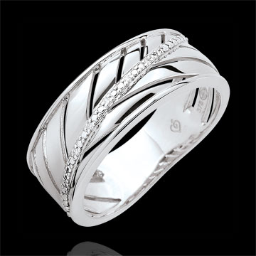 Szeroka obrączka z białego złota inspirowana liściem palmowym. Łodyga jest ozdobiona diamentami. Pierścionek doskonale nadaje się do noszenia na co dzień lub na wielkie okazje.