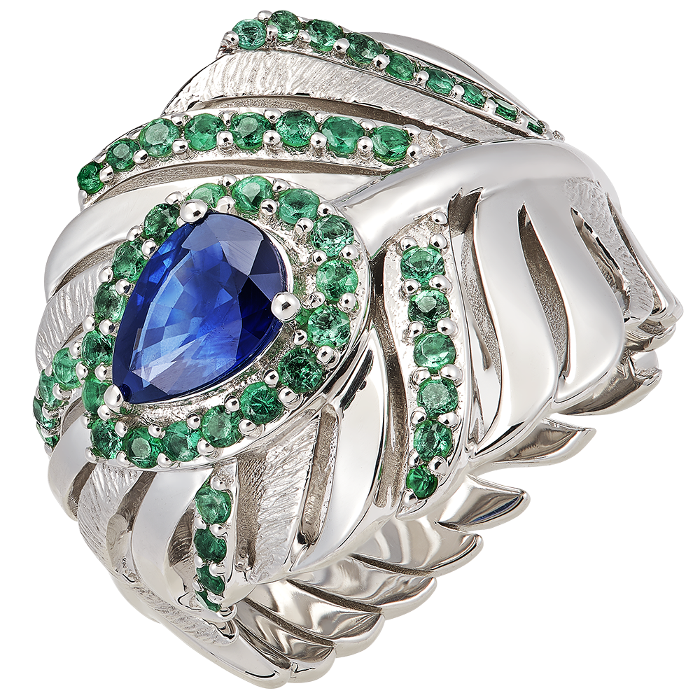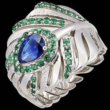 Pierścionek Impériale z 18-karatowego białego złota, z 48 syntetycznymi szmaragdami, jest wyrazem wirtuozerii przepychu i estetyki kolekcji Panache. Umieszczony pośrodku 0,650-karatowy szafir w kształcie gruszki prezentuje się niezwykle okazale.