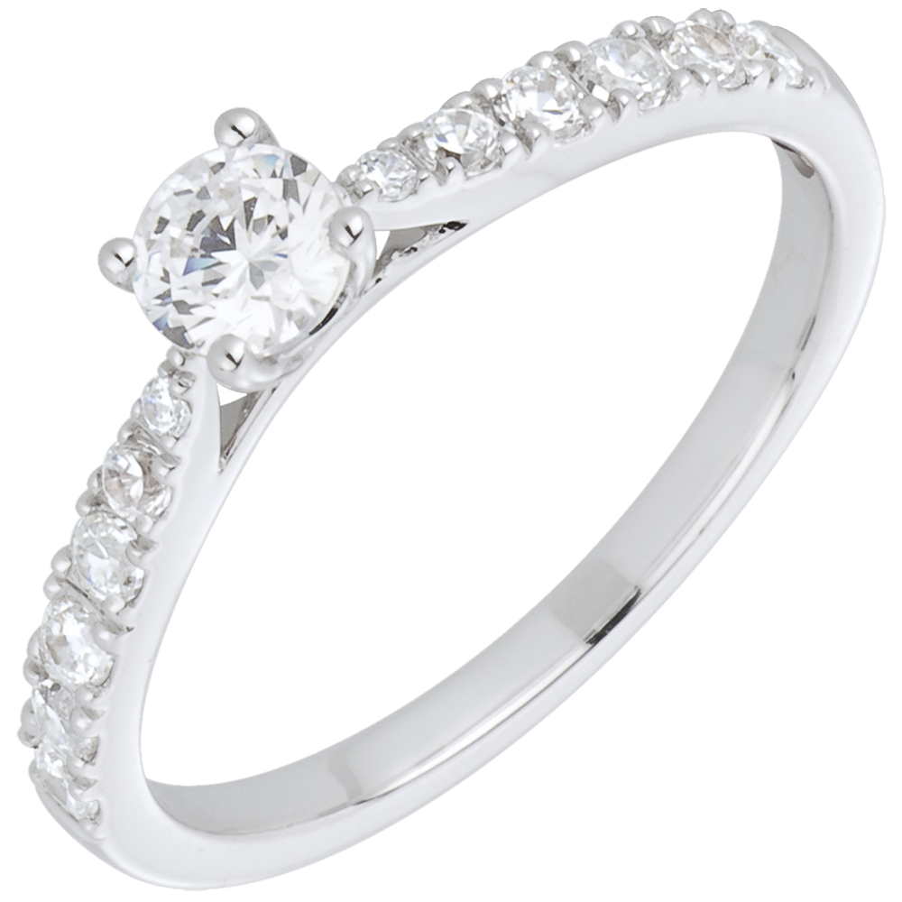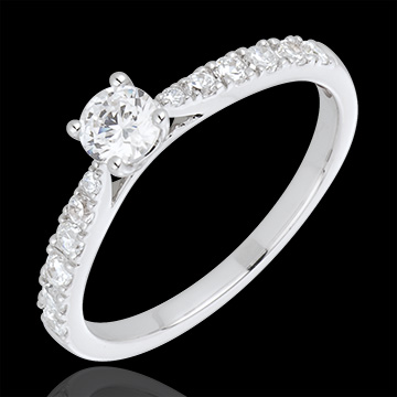 Diament środkowy w towarzystwie diamentów o szlifie brylantowym w finezyjnej i delikatnej oprawie z białego złota.