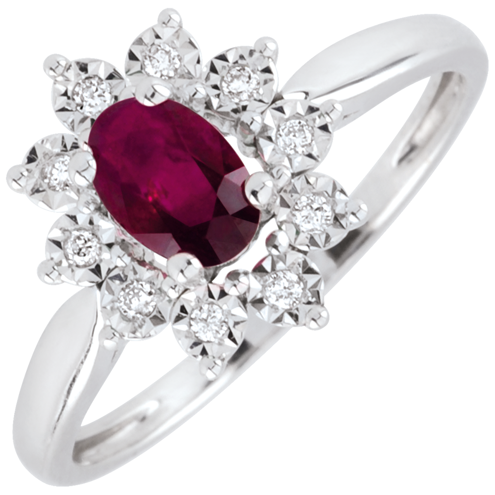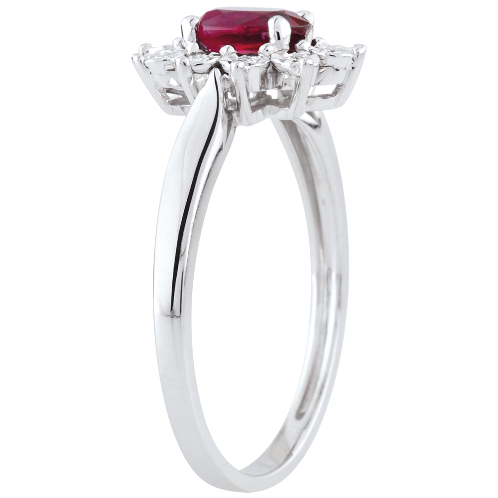 Owalny rubin stanowi środek margerytki z białego złotka z płatkami wysadzanymi diamentem.
