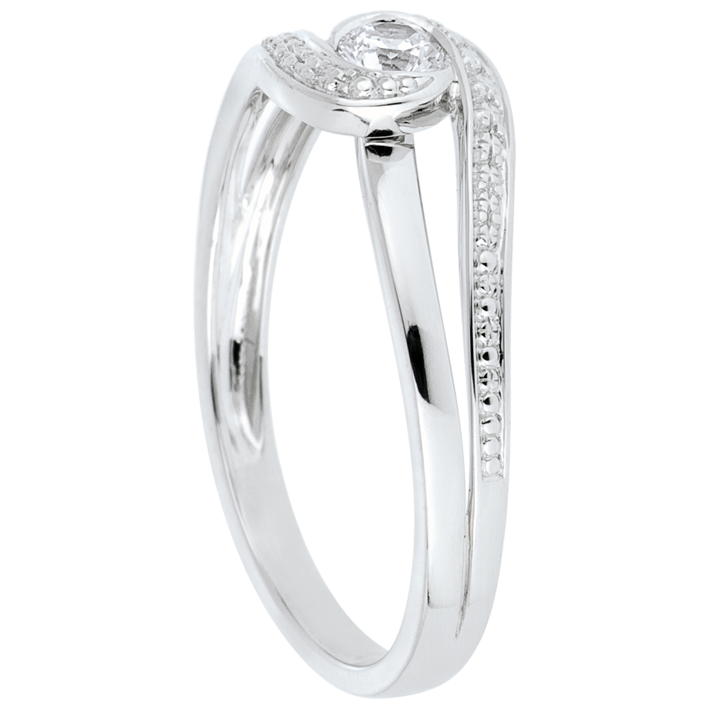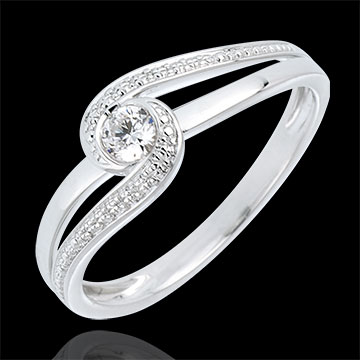 Pojedynczy diament osadzony w białym gładkim złocie o dynamicznej formie, otoczony i namiętnie przytrzymany podwójną krzywizną ze złota poddaną obróbce na wzór diamentu.