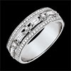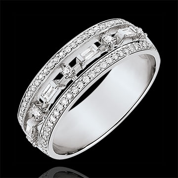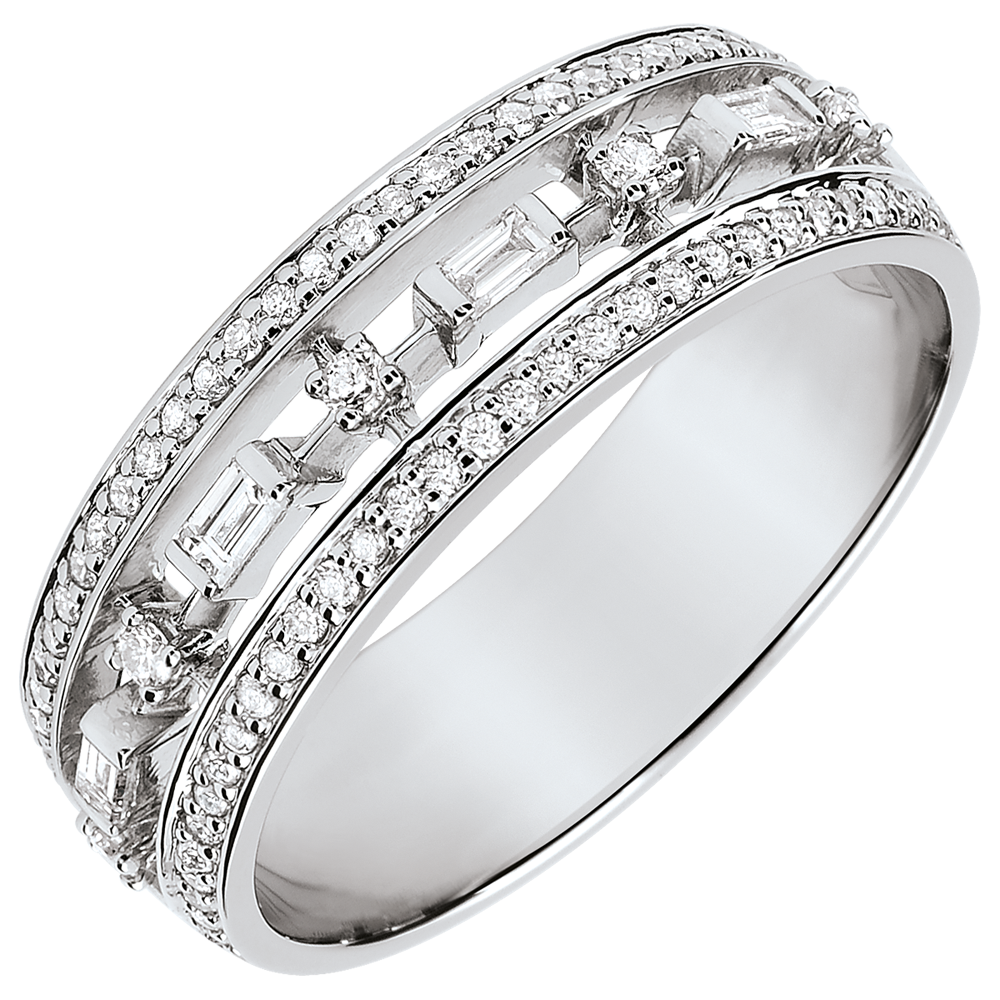 Elegancja i osobowość w pierścionku, który olśniewa wyjątkową naprzemiennością brylantów i diamentów o szlifie „bagieta” w białym złocie.