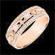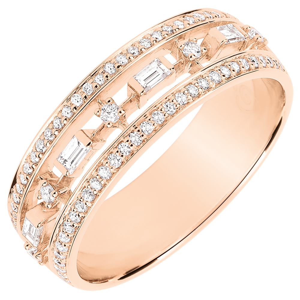 Elegancja i osobowość w pierścionku, który olśniewa wyjątkową naprzemiennością brylantów i diamentów o szlifie „bagieta” w różowym złocie. Obrączka „bagieta” jest bardziej oryginalna niż obrączka wysadzana kamieniami o szlifie „bagieta”, a jednocześnie zachowuje swoją ponadczasowość.