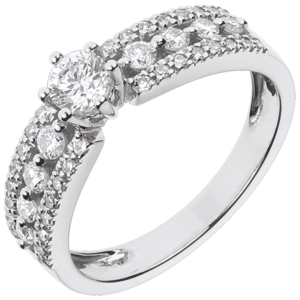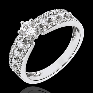 Diament środkowy oprawiony w sześć krap jest ozdobiony korowodem diamentów podkreślających jego urodę.
