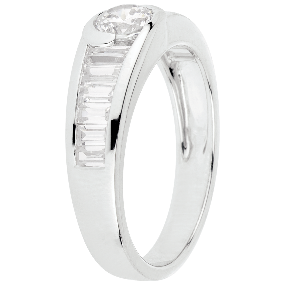 Pojedynczy diament osadzony na olśniewającej oprawie wysadzanej diamentami o szlifie „bagieta”.