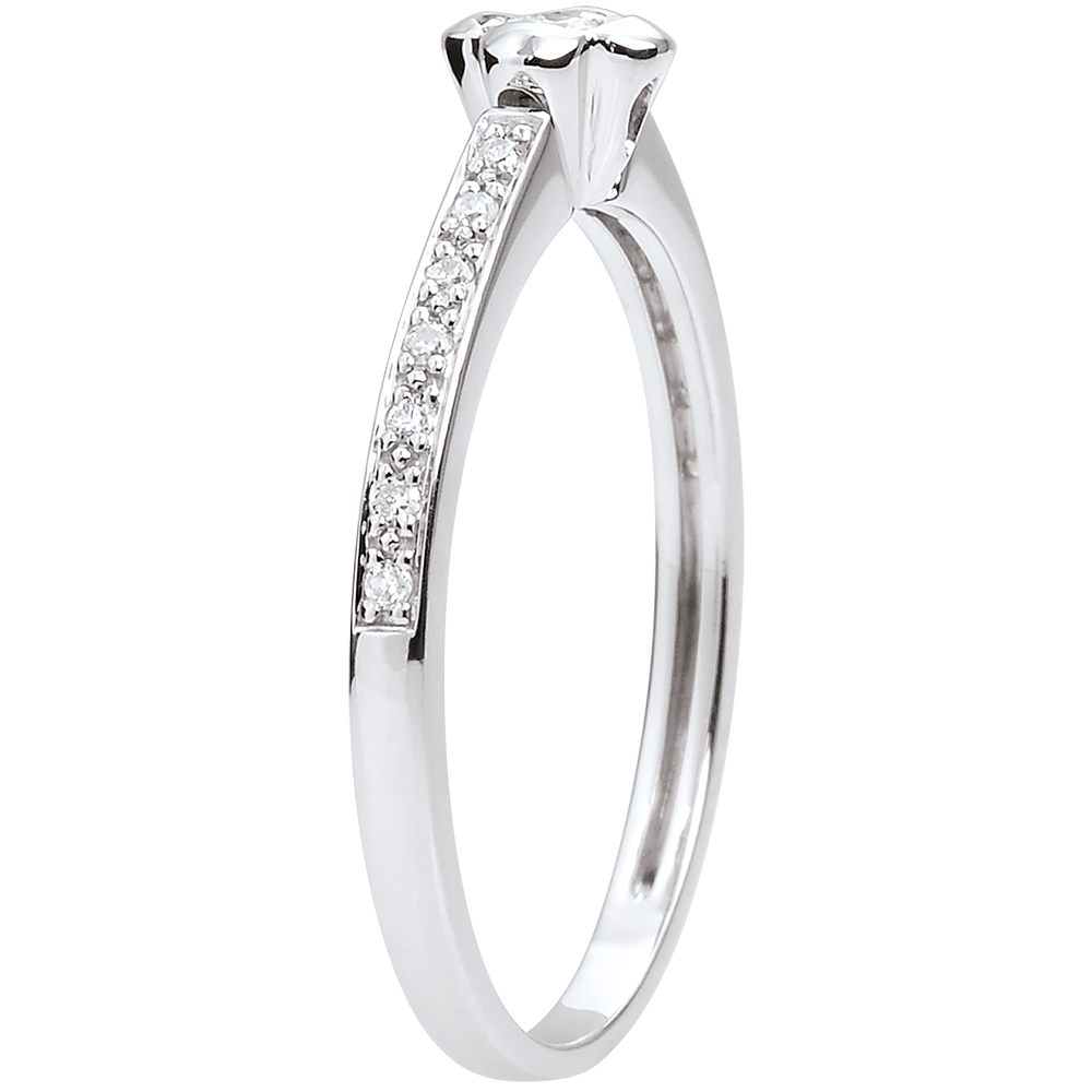 Delikatny kwiat ozdobiony pojedynczym diamentem na obrączce wysadzanej diamentami.