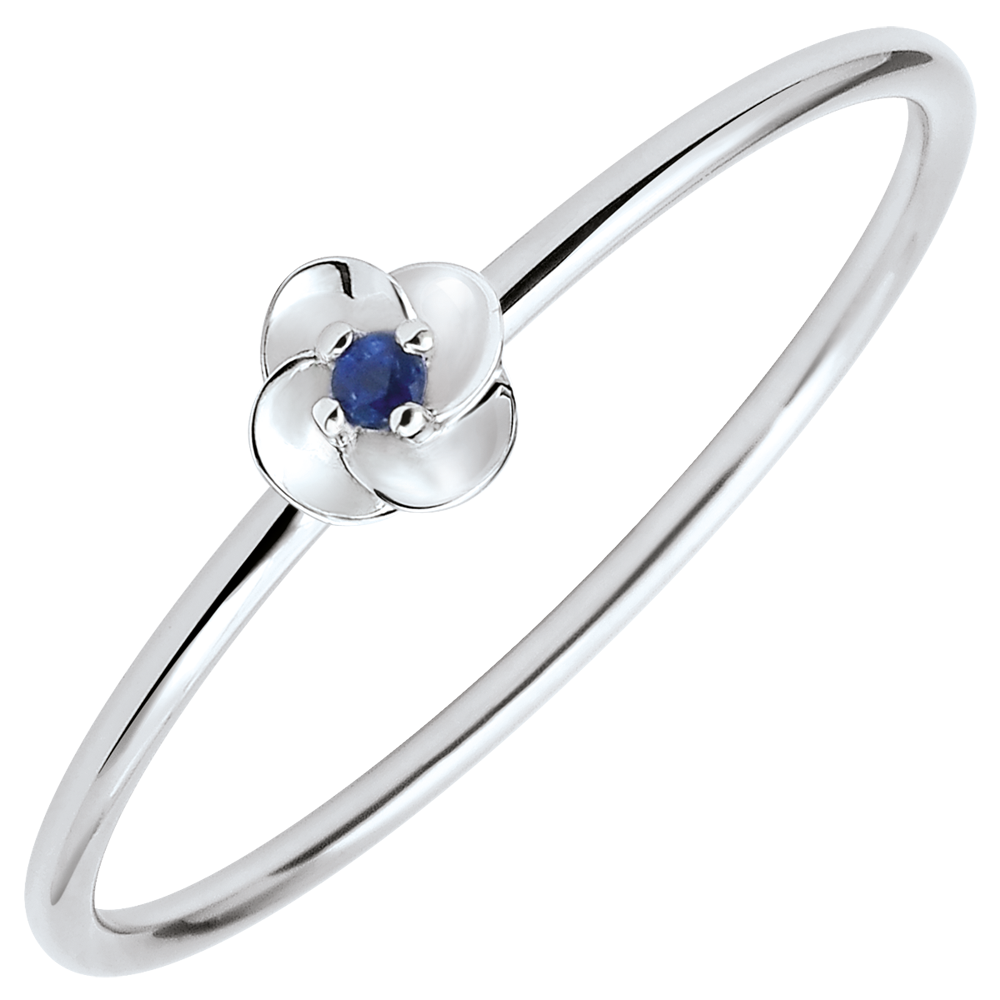 Rozwarte płatki delikatnej małej róży z białego złota ukazujące na wieki środek z szafiru.