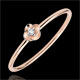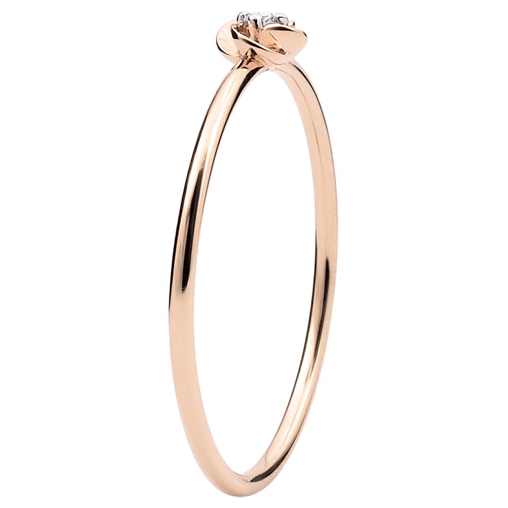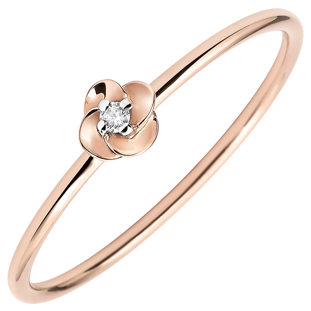 Rozwarte płatki delikatnej małej róży z różowego złota ukazujące na wieki środek z diamentu.
