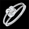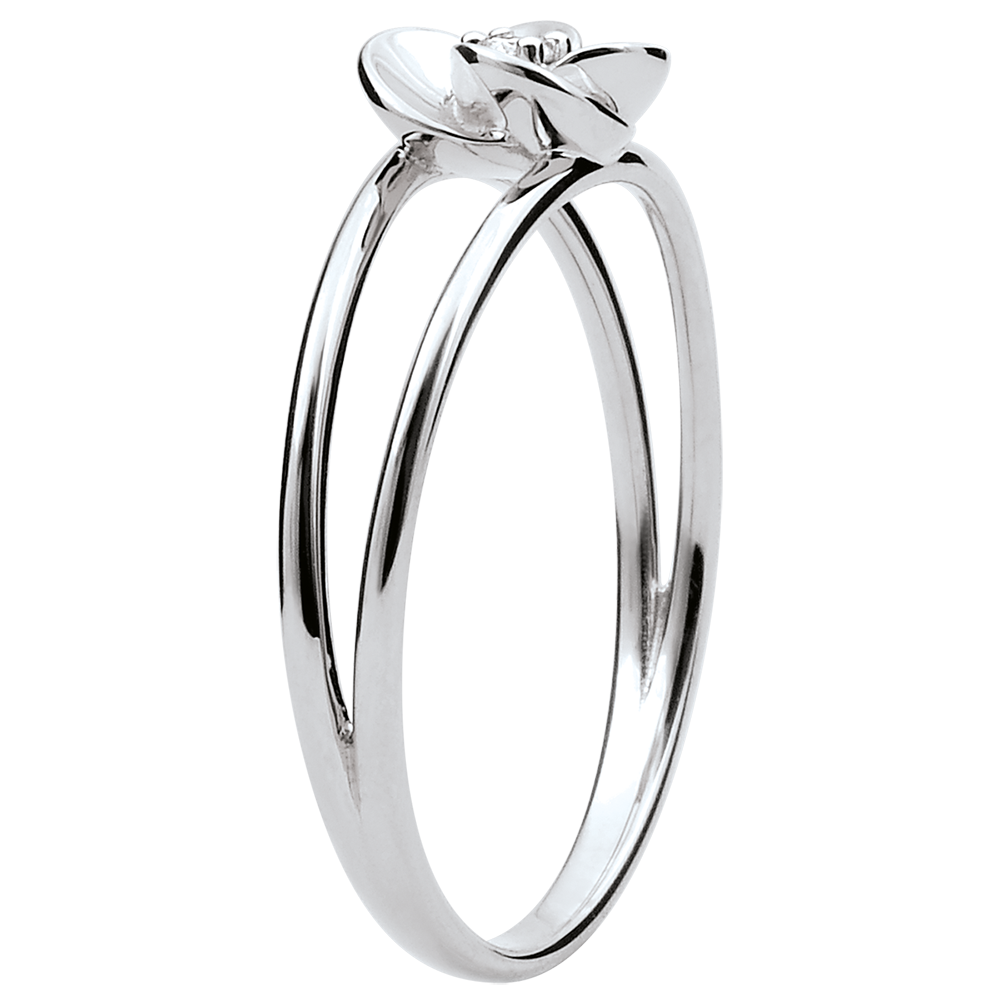 Rozwarte płatki delikatnej róży z białego złota ukazujące na wieki środek z diamentu. Kunsztowny kwiat jest osadzony na nowoczesnej i romantycznej oprawie z dwóch złotych rurek.