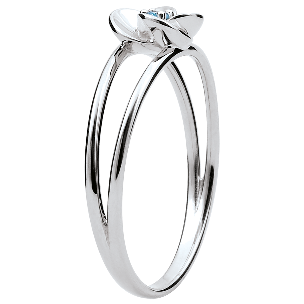 Rozwarte płatki delikatnej róży z białego złota ukazujące na wieki środek z niebieskiego topazu. Kunsztowny kwiat jest osadzony na nowoczesnej i romantycznej oprawie z dwóch złotych rurek.