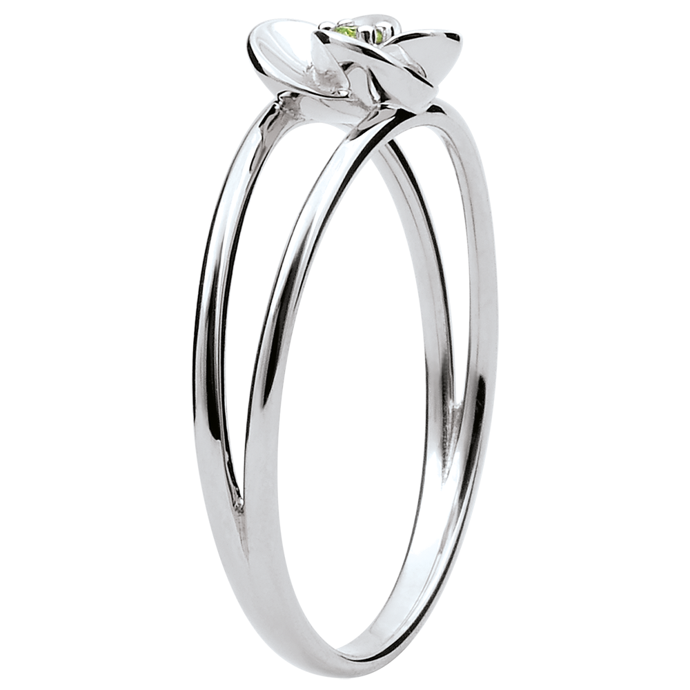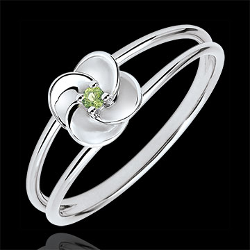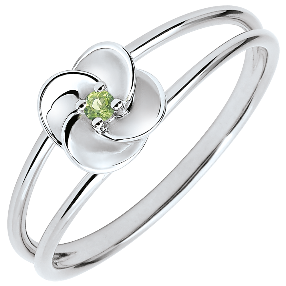 Rozwarte płatki delikatnej róży z białego złota ukazujące na wieki środek z perydotu. Kunsztowny kwiat jest osadzony na nowoczesnej i romantycznej oprawie z dwóch złotych rurek.