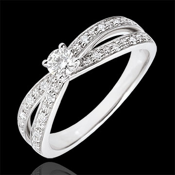 Dwie krzywe linie z białego złota wysadzane diamentami podkreślającymi subtelny diament środkowy.