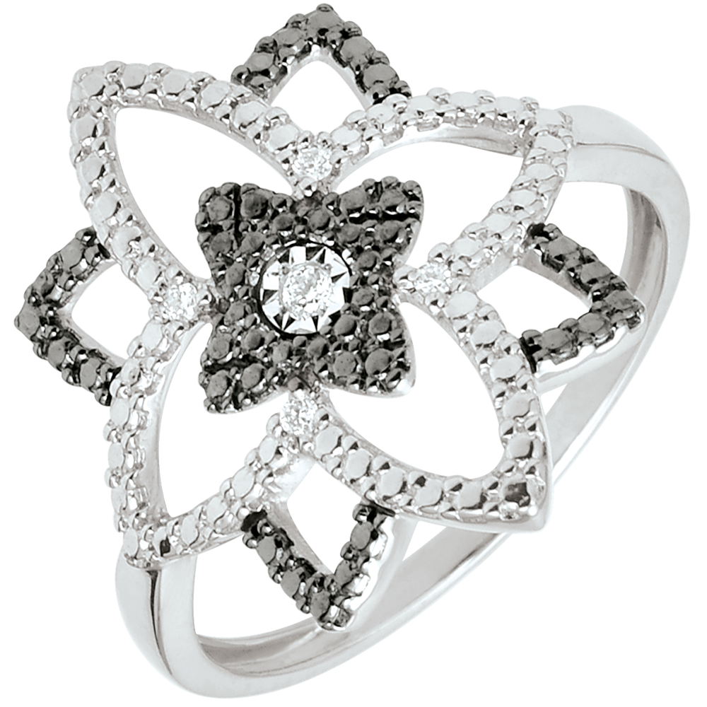 Pierścionek w kształcie kwiatu z białego złota o lekkiej strukturze, z liśćmi poddanymi obróbce na wzór diamentów, naprzemiennie w kolorze czarnym i białym. Oryginalna biżuteria.
