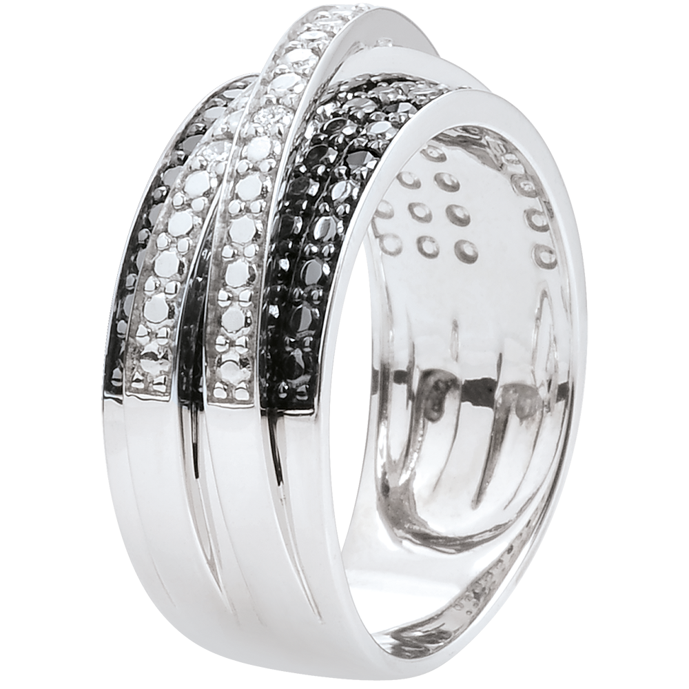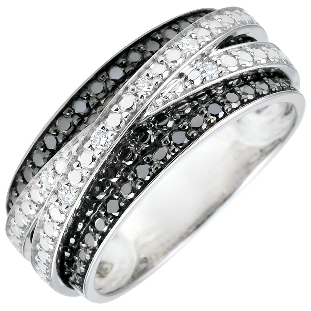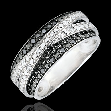 Wspaniały pierścionek Światłocień z białego złota wysadzanego 6 białymi diamentami i 8 czarnymi diamentami. Wyrafinowany i wdzięczny.