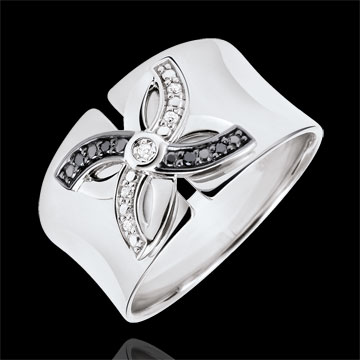 Stylizowana lilia z białego złota i czarnych diamentów na szerokiej i kunsztownej oprawie.
