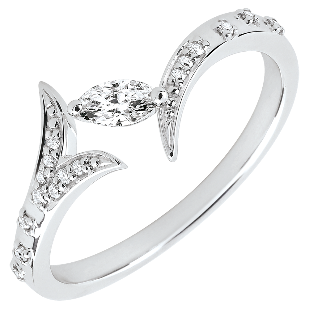 Błyszcząca gałąź utrwalona w ponadczasowej odsłonie. Jej kunsztowny liść, diamentowa łezka, jest podkreślony oprawą z białego złota wysadzanego brylantami.
