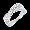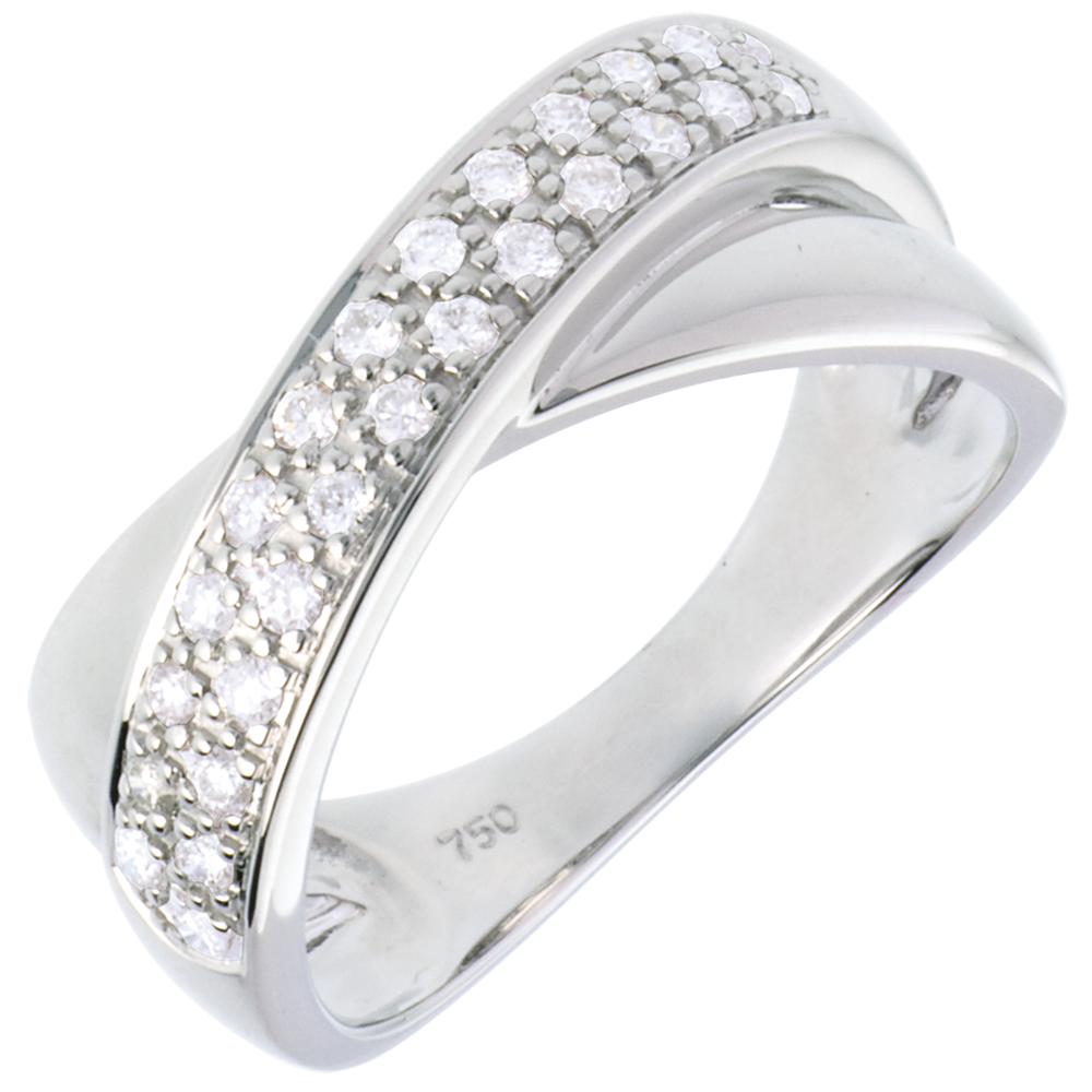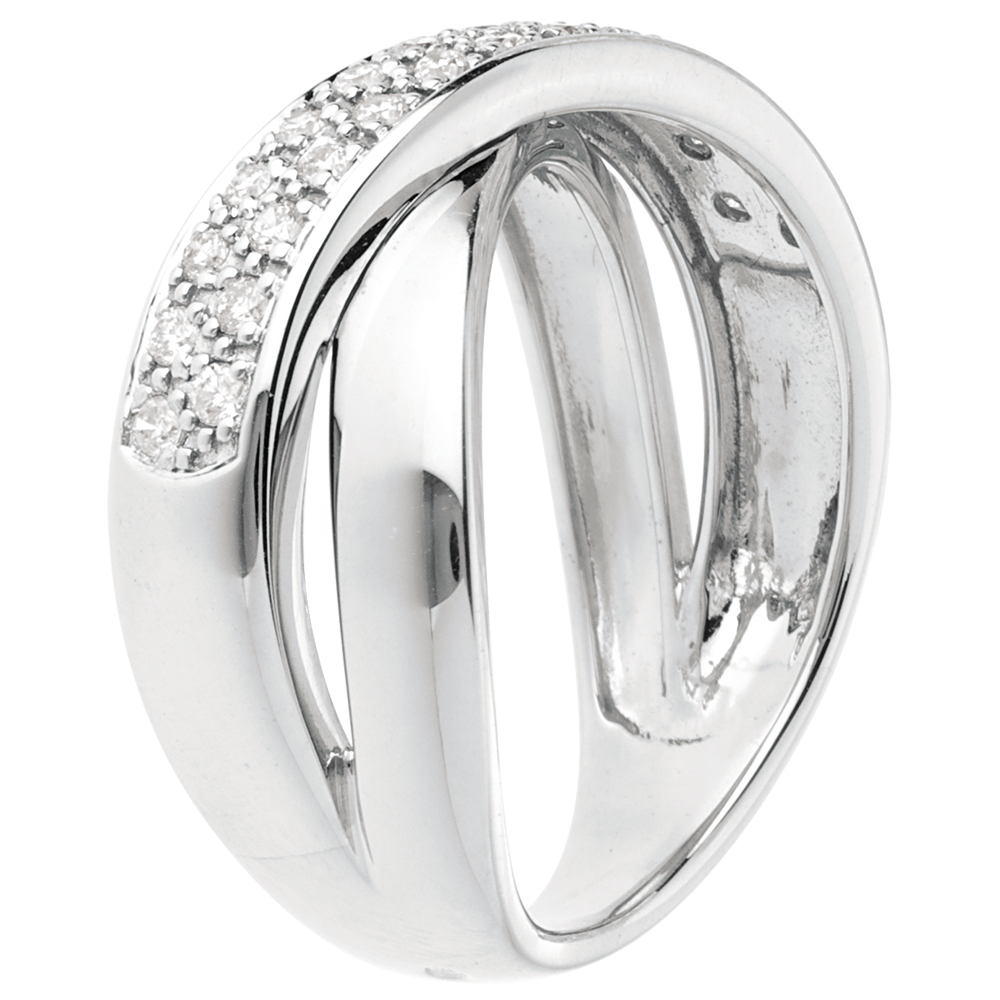 Tandem eliptycznych obrączek z białego złota i białego złota wysadzanych diamentami, symbolizujących związek i doskonałą harmonię.