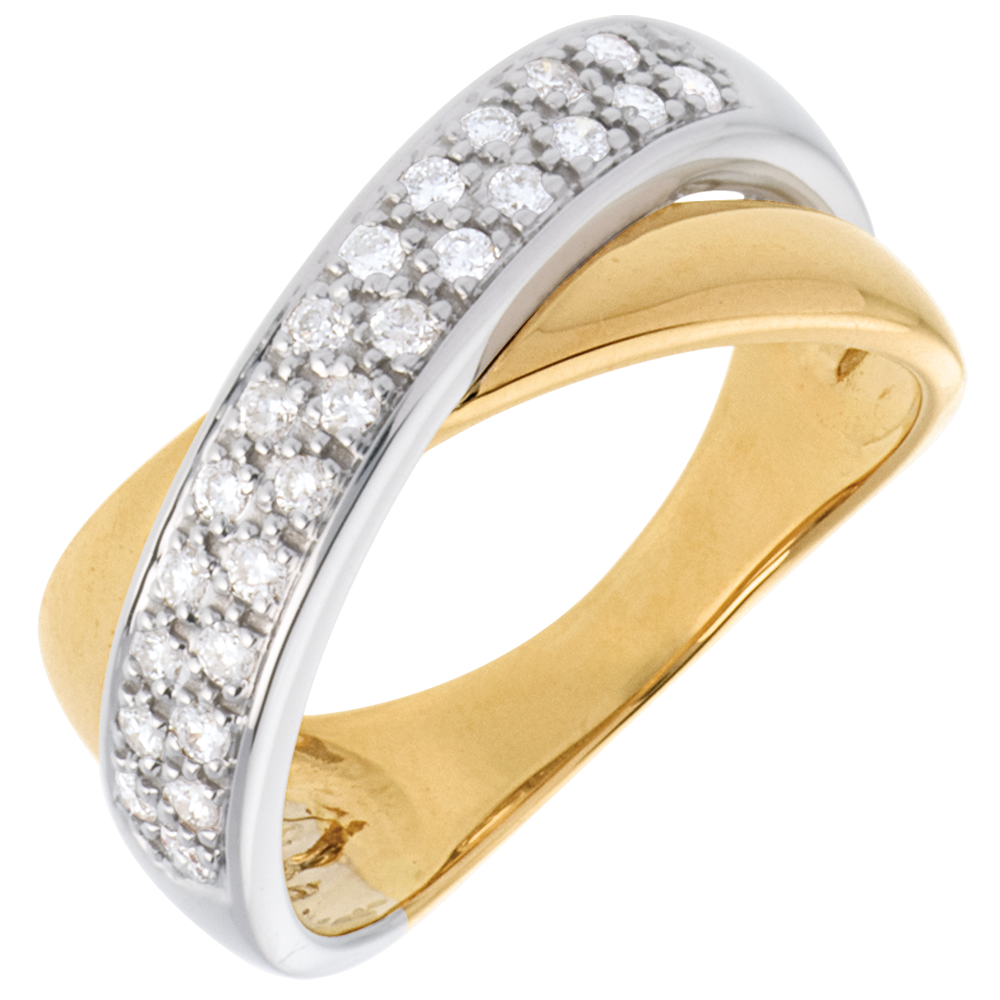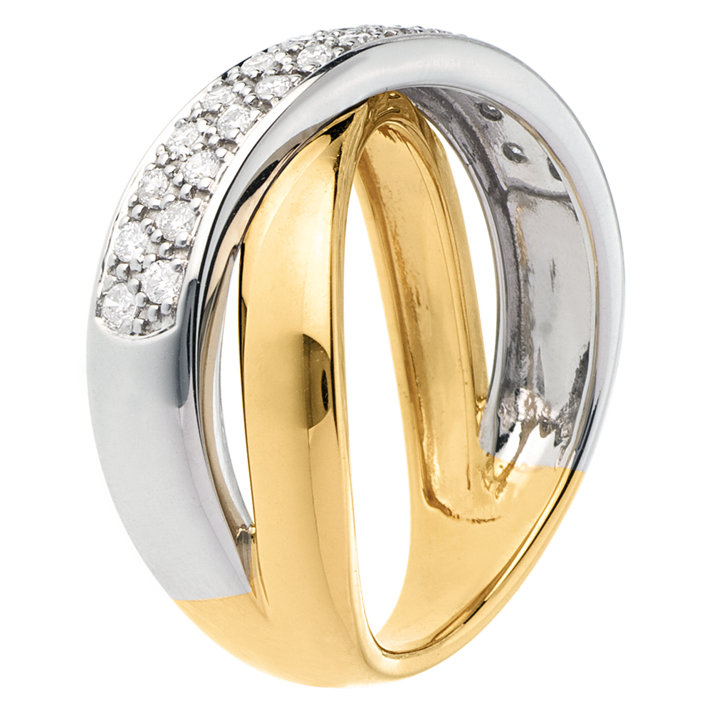 Tandem eliptycznych obrączek z białego i żółtego złota wysadzana diamentami, symbolizujących związek i doskonałą harmonię.