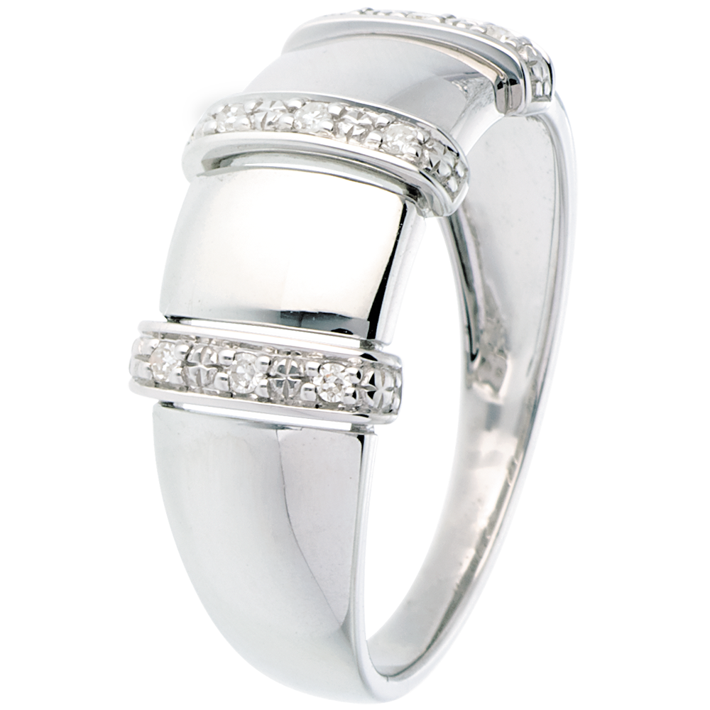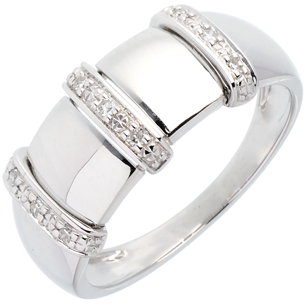 Zmysłowy pierścionek z trzema paskami wysadzanymi diamentami.