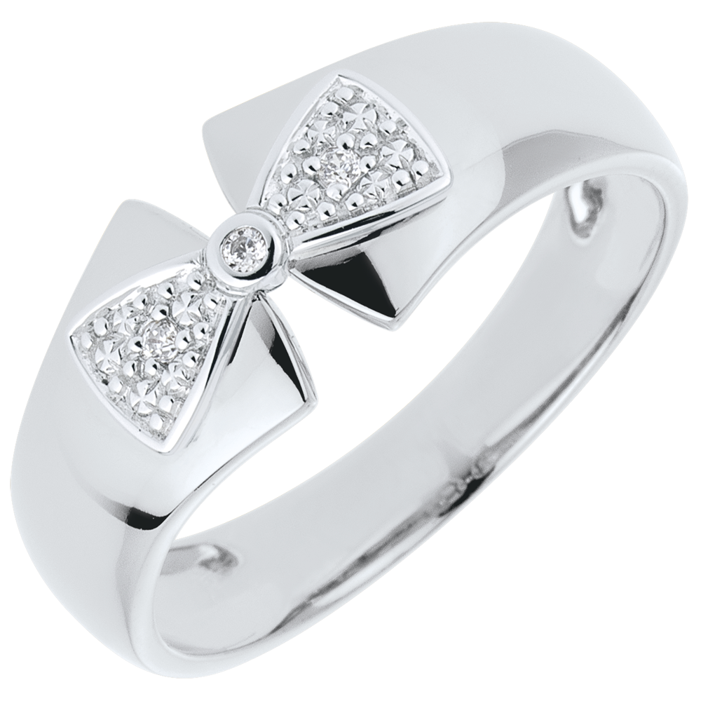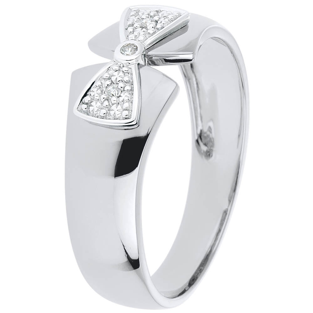 Okalająca palec wstążka z białego złota zakończona węzłem z białego złota i diamentów.