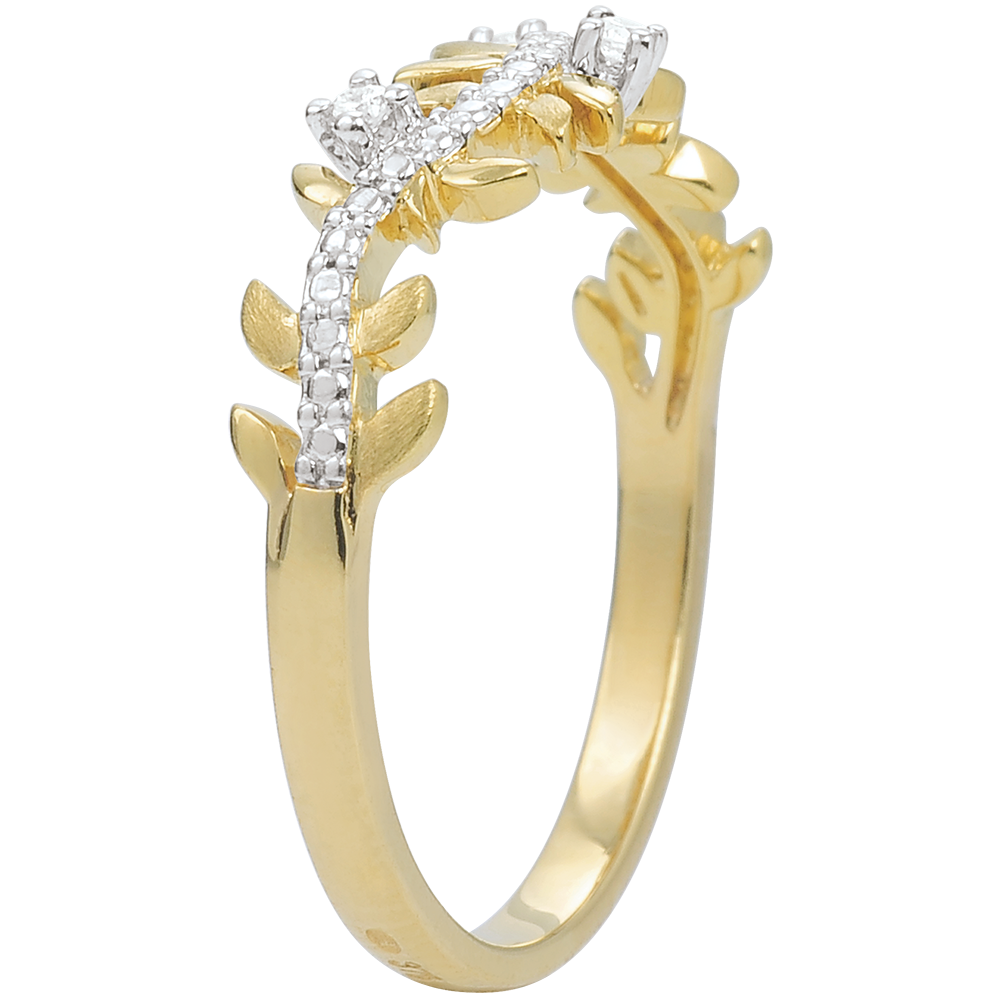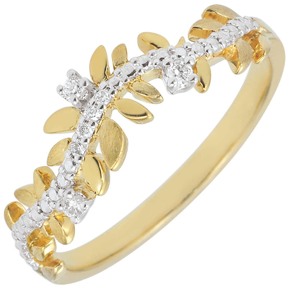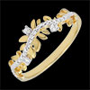 Romantyczny pierścionek wysadzany 7 diamentami, wykonany naprzemiennie z błyszczących liści z żółtego złota i z liści ze złota szczotkowanego ręcznie.