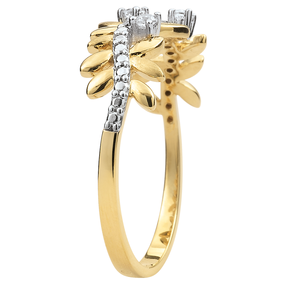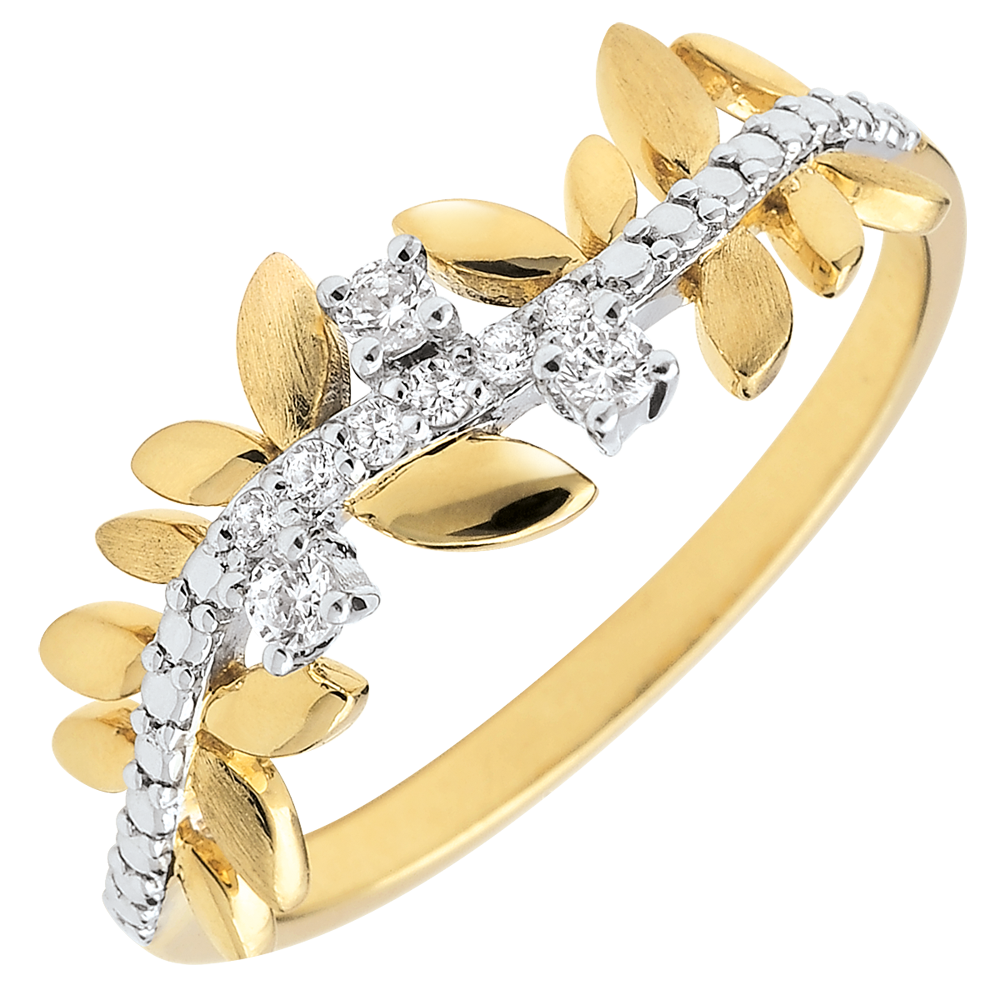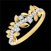 Romantyczny pierścionek wysadzany 9 diamentami, wykonany naprzemiennie z błyszczących liści z żółtego złota i z liści ze złota szczotkowanego ręcznie.
