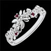 Romantyczny pierścionek wysadzany diamentami i rodolitami, wykonany naprzemiennie z błyszczących liści z białego złota i z liści ze złota szczotkowanego ręcznie.