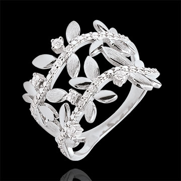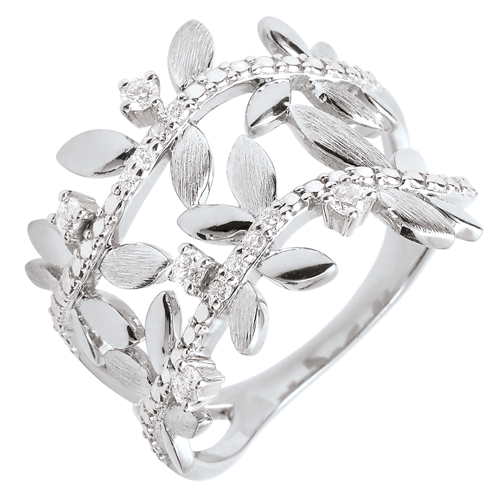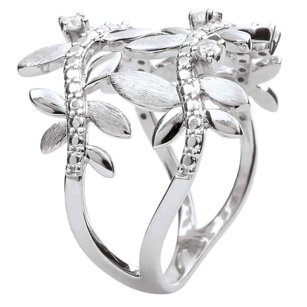 Romantyczny pierścionek z białego złota wysadzany 13 diamentami, wykonany naprzemiennie z błyszczących złotych liści i z liści ze złota szczotkowanego ręcznie.
