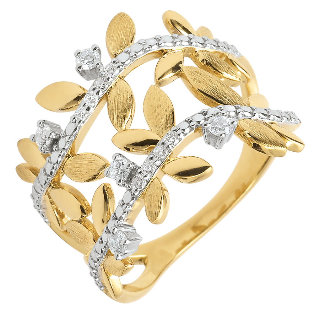 Romantyczny pierścionek z żółtego złota wysadzany 13 diamentami, wykonany naprzemiennie z błyszczących złotych liści i z liści ze złota szczotkowanego ręcznie.