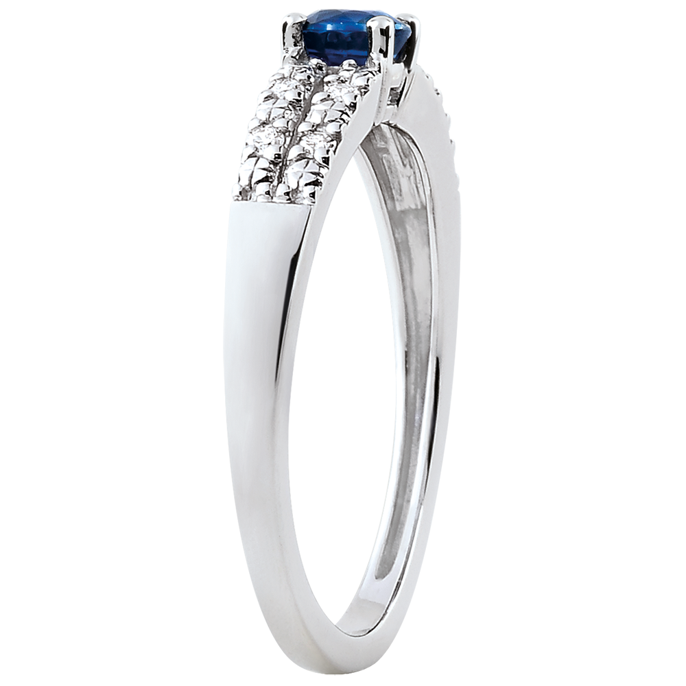 Na obrączce z białego złota wysadzanej dwoma rzędami błyszczących brylantów króluje pojedynczy szafir. Prosta i czysta forma pierścionka z kamieniem środkowym w otoczeniu diamentów.