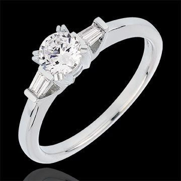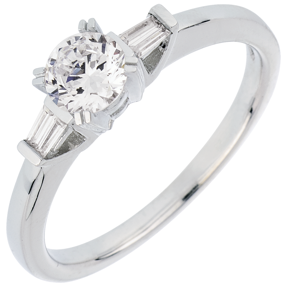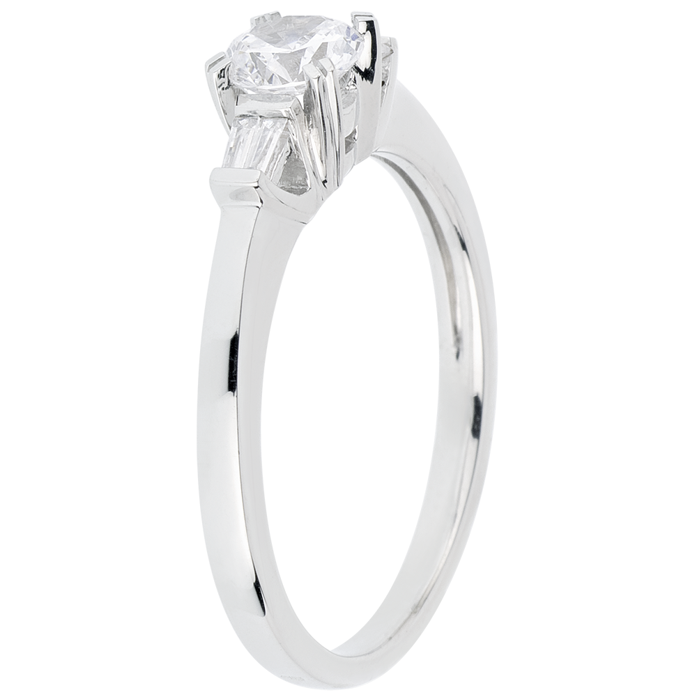 Pojedynczy diament elegancko uzupełniony dwoma diamentami o szlifie „bagieta”.