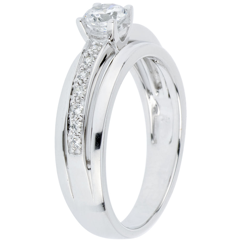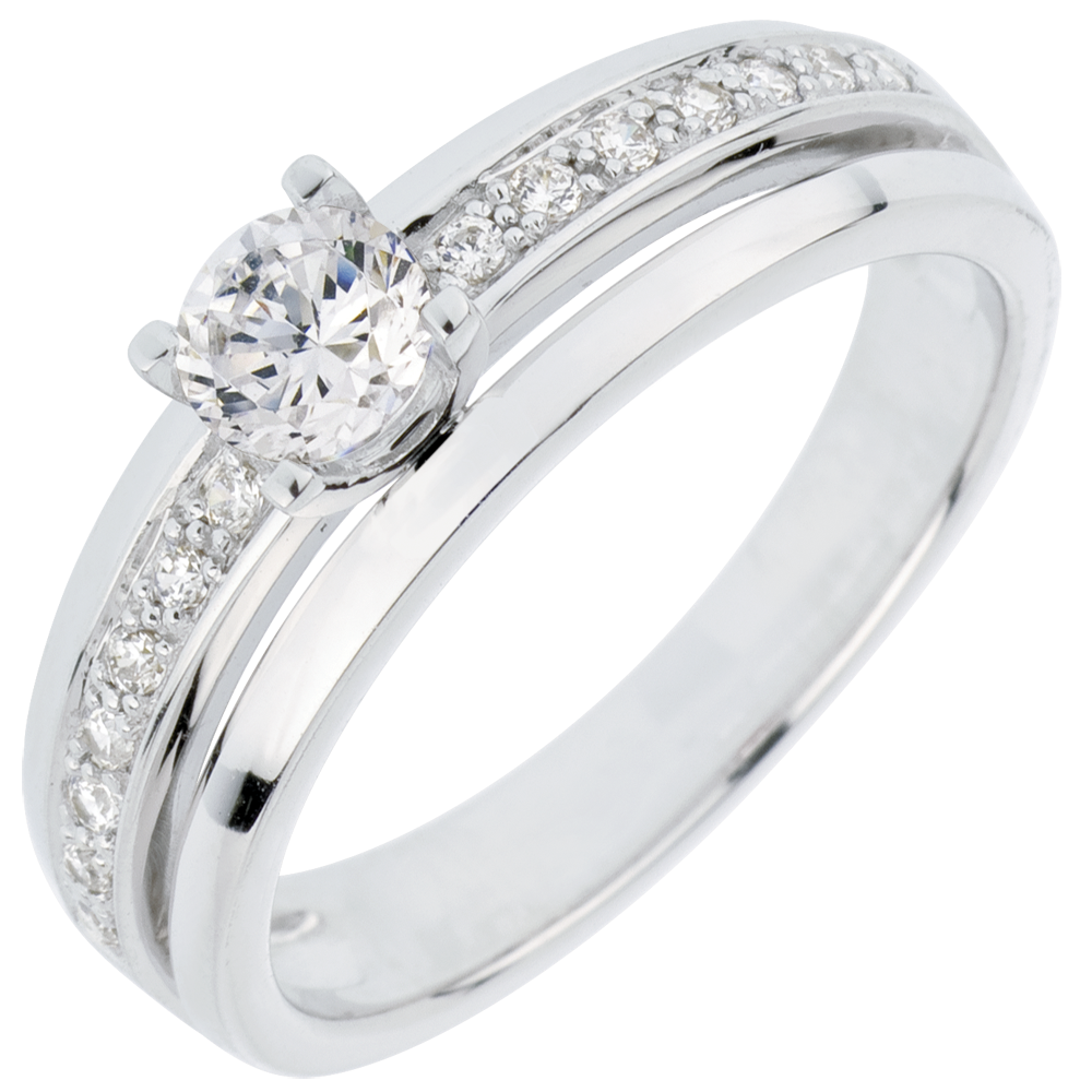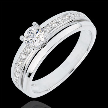 Pojedynczy diament w czterech krapach osadzony na eleganckiej oprawie wysadzanej diamentami o szlifie brylantowym.