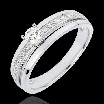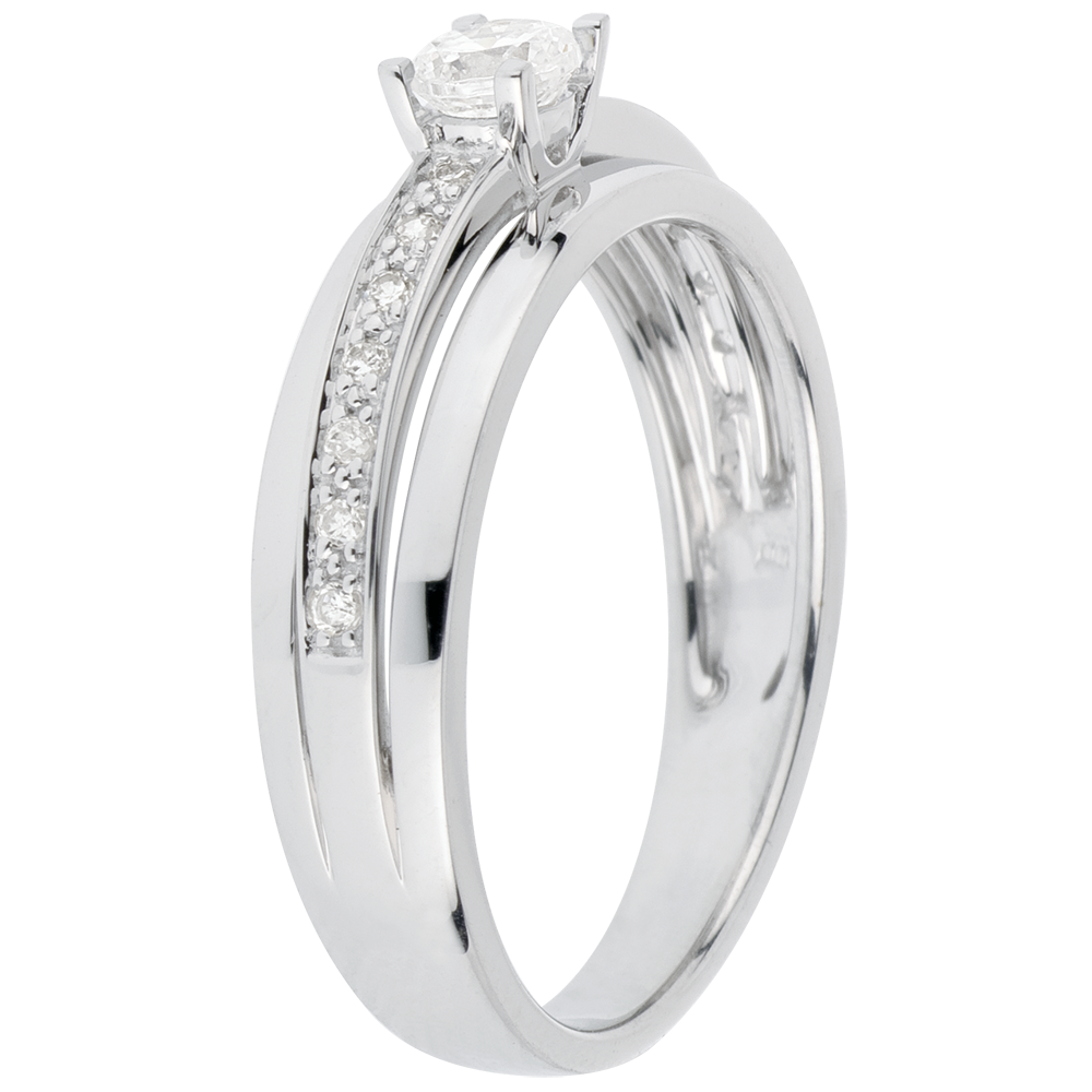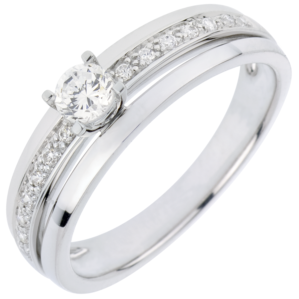 Pojedynczy diament w czterech krapach osadzony na eleganckiej oprawie wysadzanej diamentami o szlifie brylantowym.