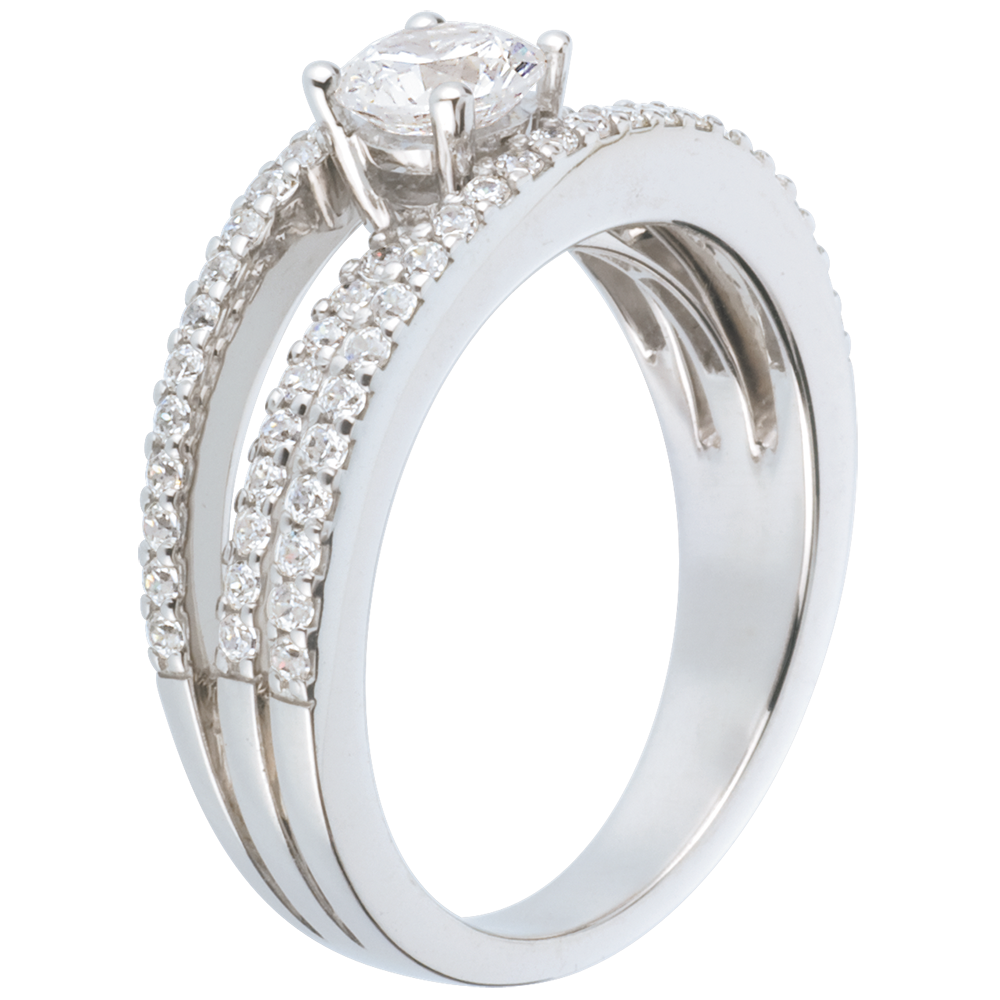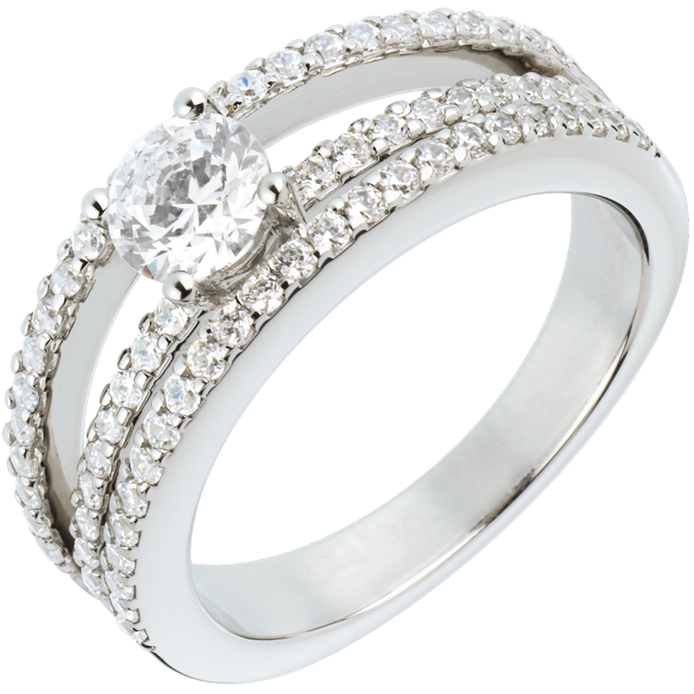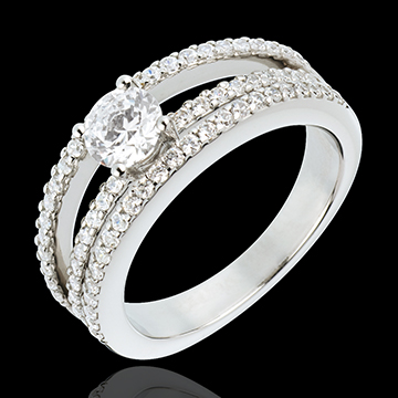 Architektoniczna oprawa z trzech pierścieni wysadzanych diamentami dla podkreślenia pojedynczego diamentu. Wspaniały pierścionek zaręczynowy z białego złota.