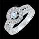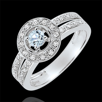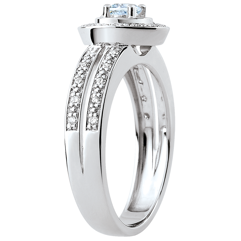 Środkowy akwamaryn elegancko podkreślony oprawą z brylantów. Całość osadzona na podwójnej obrączce wysadzanej diamentami podkreślającej splendor tego pierścionka zaręczynowego z białego złota.