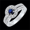Środkowy szafir elegancko podkreślony oprawą z brylantów. Całość osadzona na podwójnej obrączce wysadzanej diamentami podkreślającej splendor tego pierścionka zaręczynowego z białego złota.