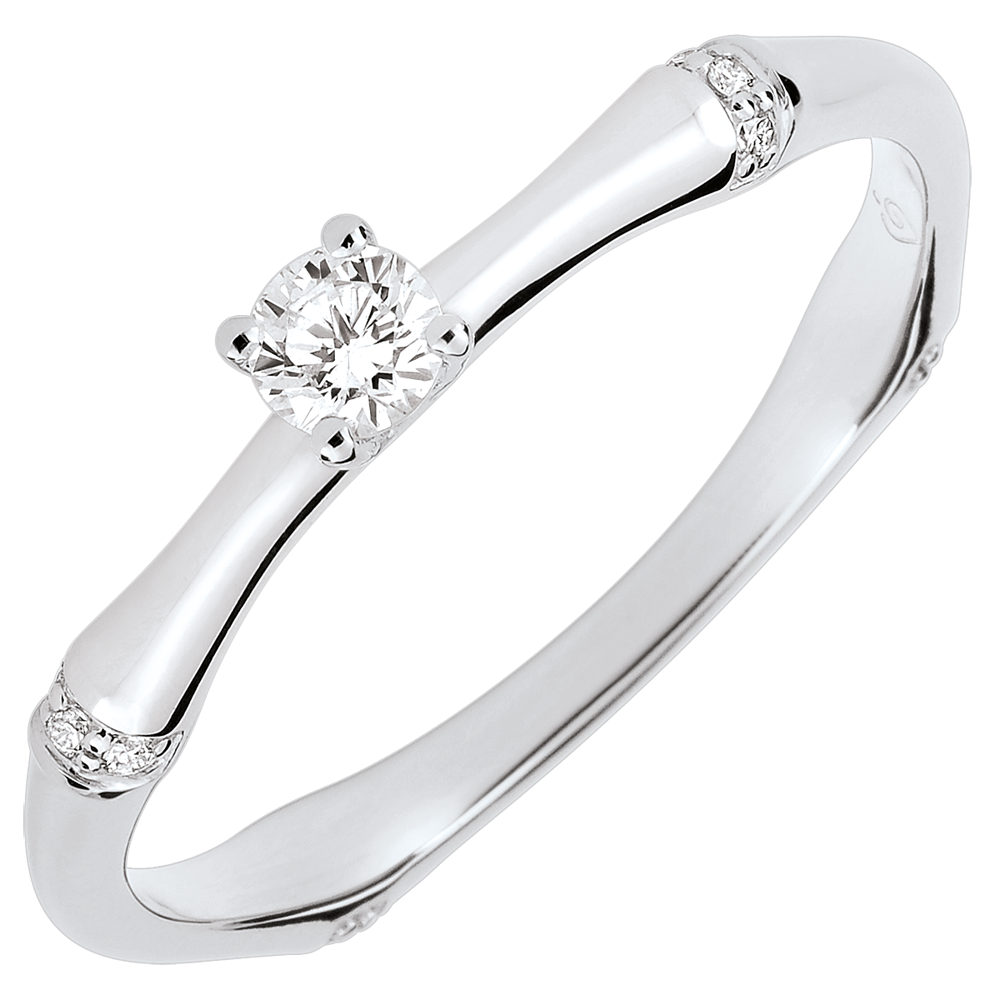Elastyczna i trwała bambusowa tyczka przeobrażona w wieczny pierścionek zaręczynowy. Złączenia bambusa są wysadzane diamentami osadzonymi w białym złocie dla podkreślenia diamentu środkowego.