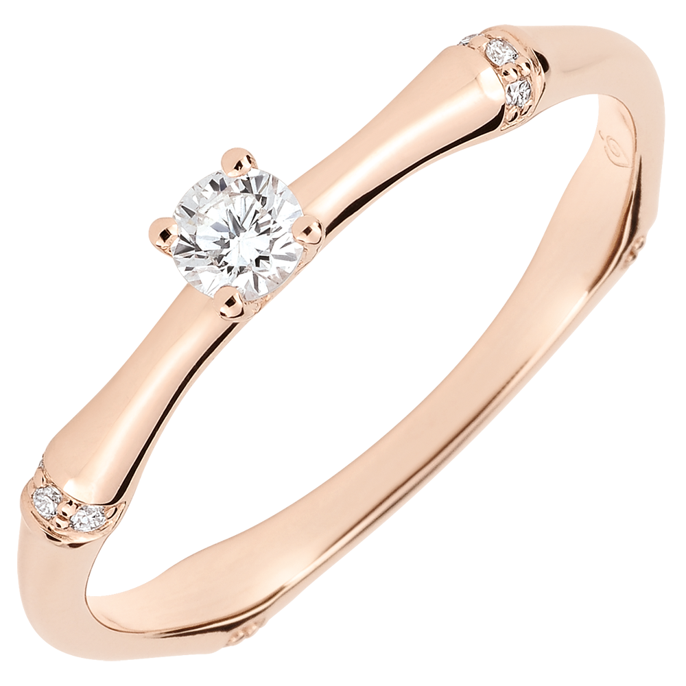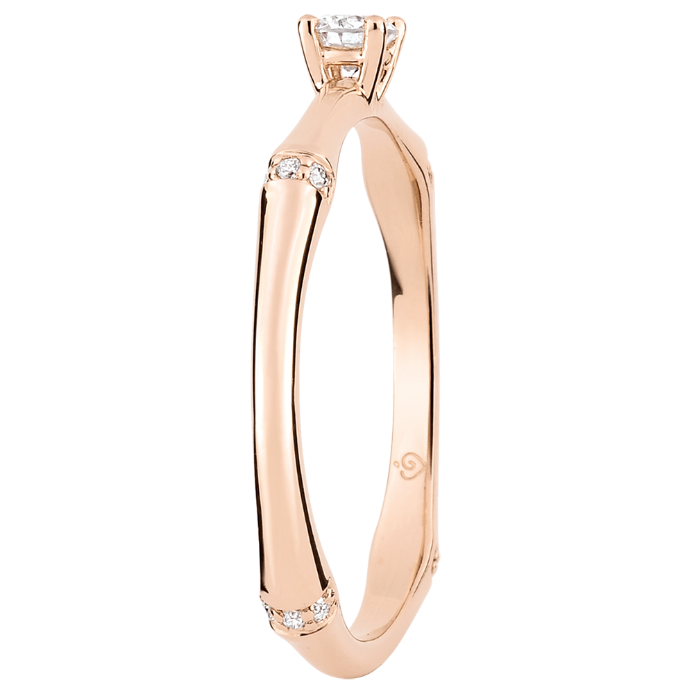 Elastyczna i trwała bambusowa tyczka przeobrażona w wieczny pierścionek zaręczynowy. Złączenia bambusa są wysadzane diamentami osadzonymi w różowym złocie dla podkreślenia diamentu środkowego.