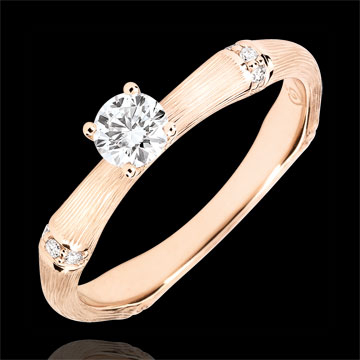 Elastyczna i trwała bambusowa tyczka przeobrażona w wieczny pierścionek zaręczynowy. Złączenia bambusa są wysadzane diamentami osadzonymi w szczotkowanym różowym złocie dla podkreślenia diamentu środkowego. Wykonane ręcznie wykończenie matowe nadaje obrączce ujmujący naturalny i realistyczny wygląd.