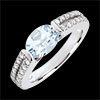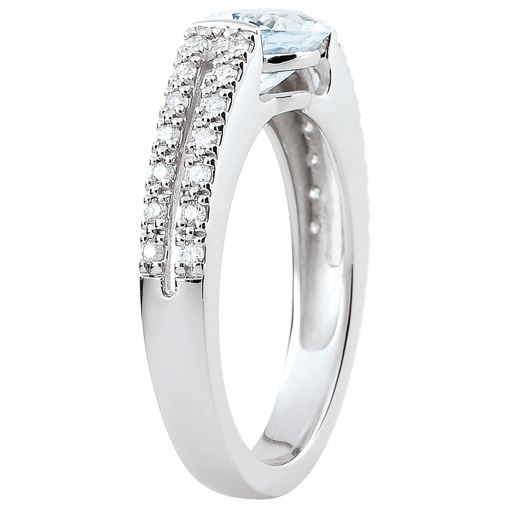 Nowoczesny i elegancki pierścionek zaręczynowy z białego złota z akwamarynem podkreślonym oprawą w postaci podwójnej obrączki wysadzanej diamentami.