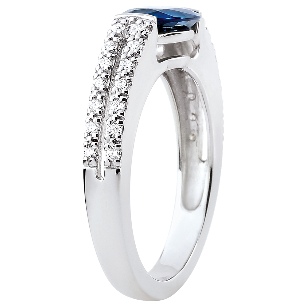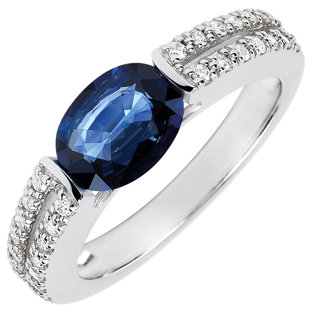Nowoczesny i elegancki pierścionek zaręczynowy z białego złota z szafirem podkreślonym oprawą w postaci podwójnej obrączki wysadzanej diamentami.