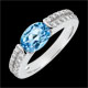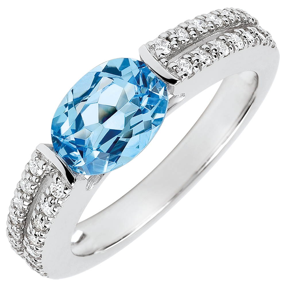 Nowoczesny i elegancki pierścionek zaręczynowy z białego złota z topazem podkreślonym oprawą w postaci podwójnej obrączki wysadzanej diamentami.