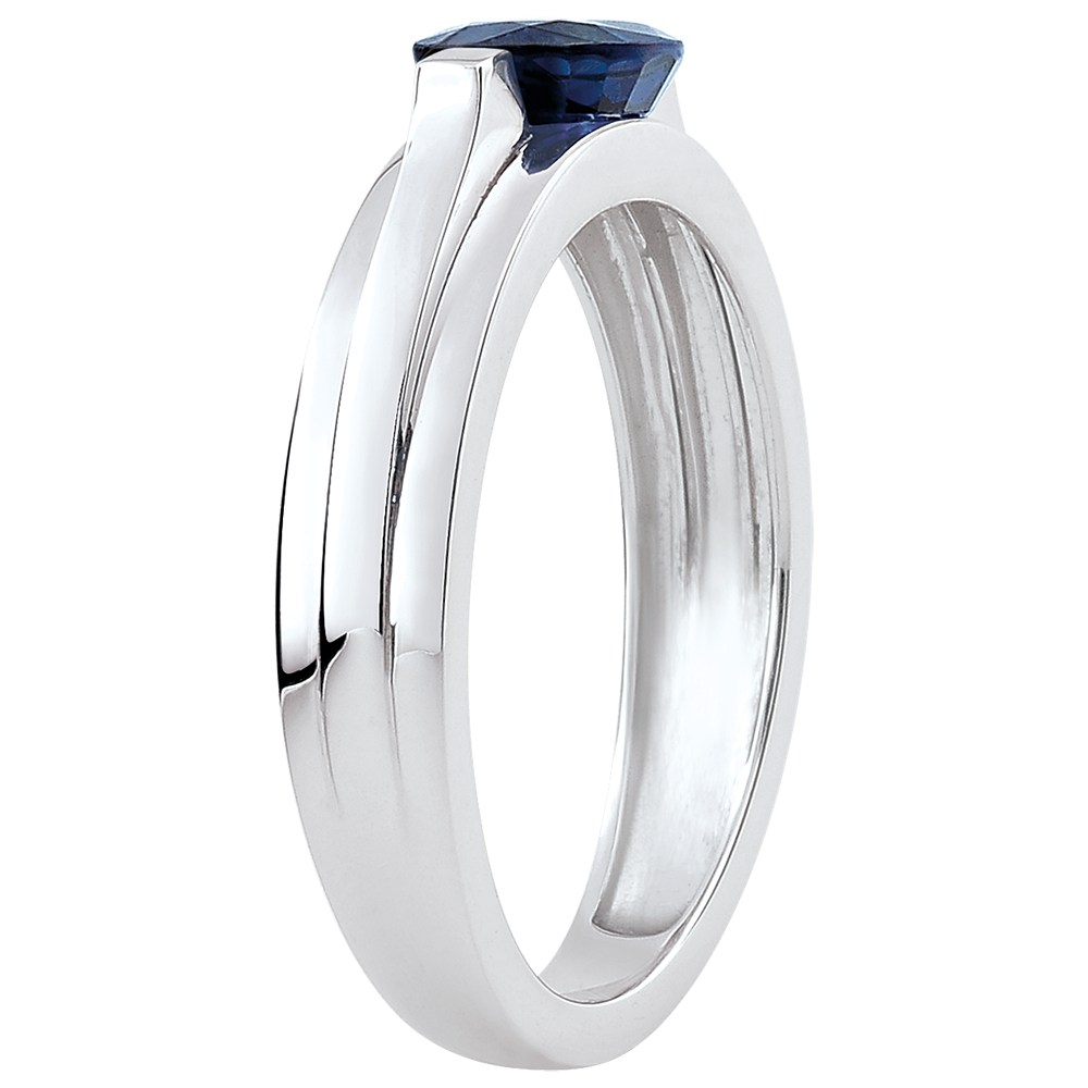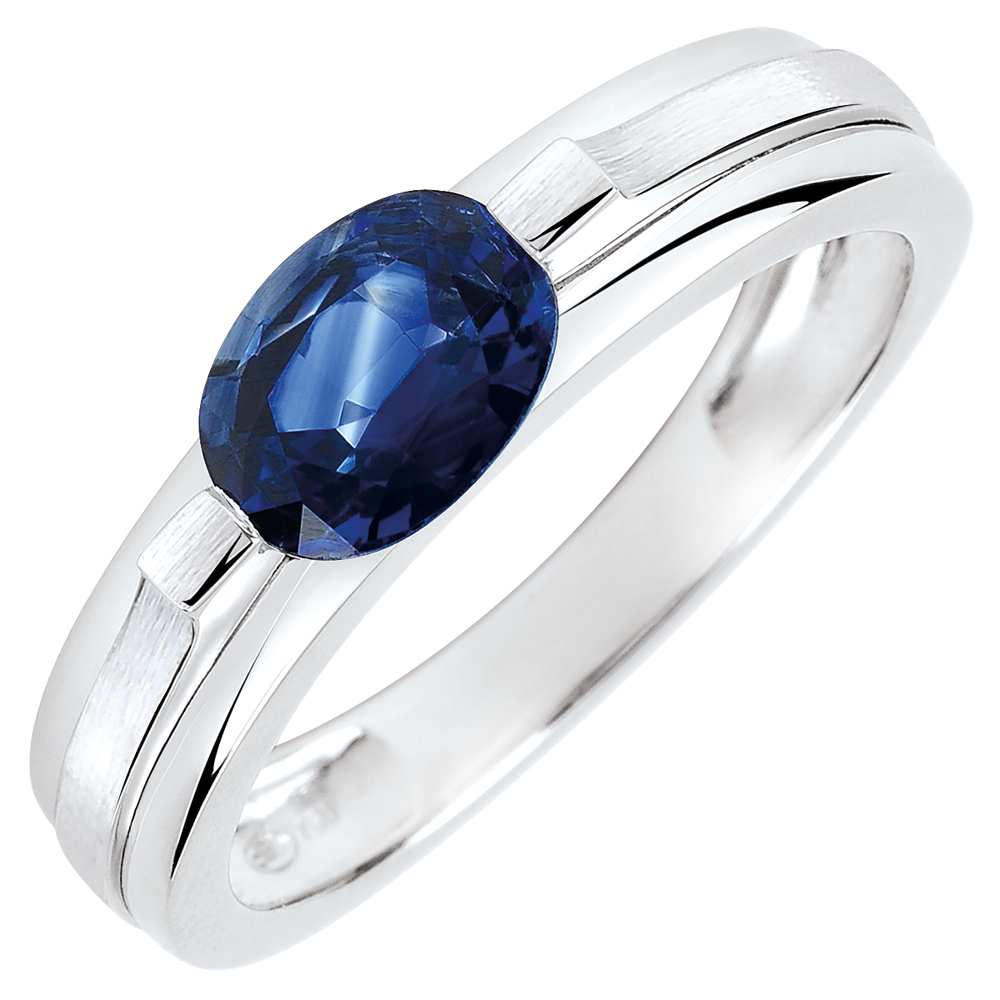 Oprawa z elegancko podkreśla subtelny szafir o czystej i surowej urodzie. Nowoczesny pierścionek zaręczynowy z białego złota .