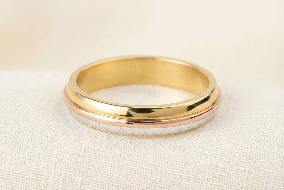 Trzy obrączki z trzech rodzajów złota błyszczące jak dzieci słońca.