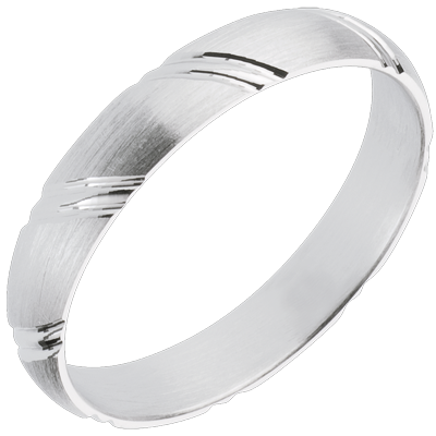 Prosty i graficzny motyw podkreślający klasyczną elegancję obrączki z białego złota.