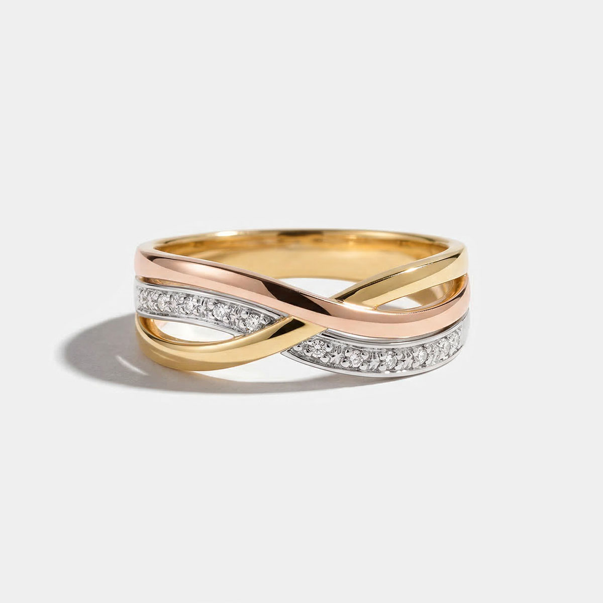 - Splecione obrączki z białego, żółtego i różowego złota 9 karat dla unikalnego wzoru