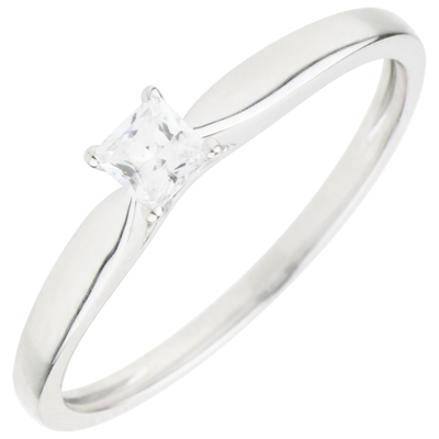 Pierścionek Objawienie z jednym diamentem - diament o szlifie „princessa” oprawiony w 4 krapy - złoto białe 9-karatowe